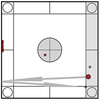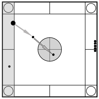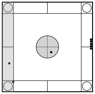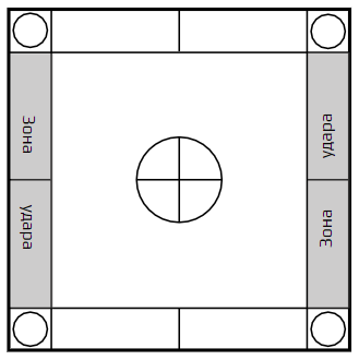 Темных зоны две: круг посередине игрового поля и своя зона удара (то есть зона удара, из которой игрок производит удар).