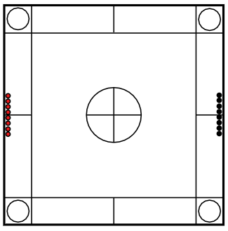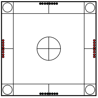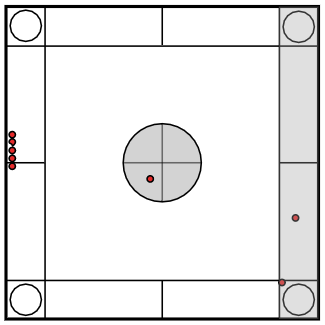Если пешка вылетела за борт, то она ставится в круг на пересечение линий. Если центральное пересечение линий уже занято пешкой, то ставится в круг на пересечение окружности и диаметра с той стороны, за который борт пешка перелетела.